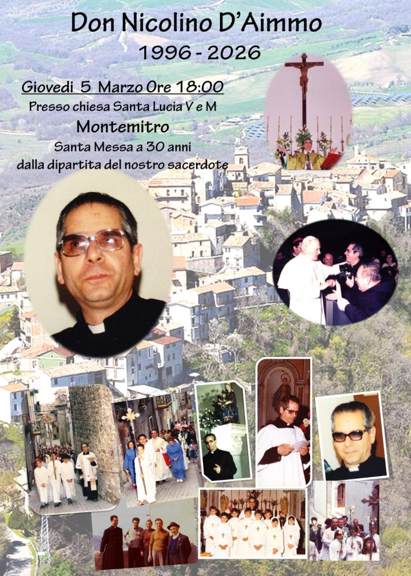 Montemitro ricorda don Nicolino D’Aimmo a 30 anni dalla morte. Dalla sua ultima messa: “Se il chicco di grano caduto in terra non muore rimane solo; se invece muore produce molto frutto” (Gv 12, 24). Nato il primo febbraio 1938, salito in Cielo il 5 marzo 1996. Parroco di Montemitro dal primo settembre 1965 al 5 marzo 1996. Il programma della commemorazione prevede alle 18 … Continua a leggere Montemitro ricorda don Nicolino D’Aimmo a 30 anni dalla morte »