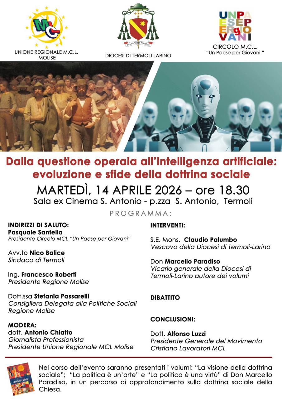 Dal territorio 7 Aprile 2026 Dalla questione operaia all’intelligenza artificiale: evoluzione e sfide della dottrina sociale: 14 aprile convegno a Termoli Dalla questione operaia all’intelligenza artificiale: evoluzione e sfide della dottrina sociale: 14 aprile convegno a Termoli. La locandina condividi su