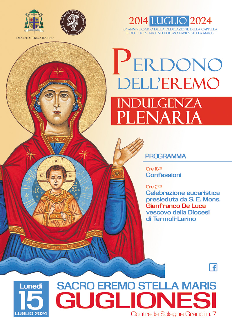 Lunedì 15 luglio 2024 si rinnova la Giornata del Perdono al sacro eremo diocesano ‘Lavra Stella Maris’. Una giornata di preghiera, incontro, raccoglimento e condivisione in un’oasi di pace e spiritualità in contrada Solagne Grandi, 7 (Guglionesi). In questa occasione, accostandosi alla preghiera, alla confessione e alla comunione sacramentale, sarà possibile ricevere l’indulgenza plenaria come da decreto trasmesso dalla Penitenzieria Apostolica della Santa Sede.