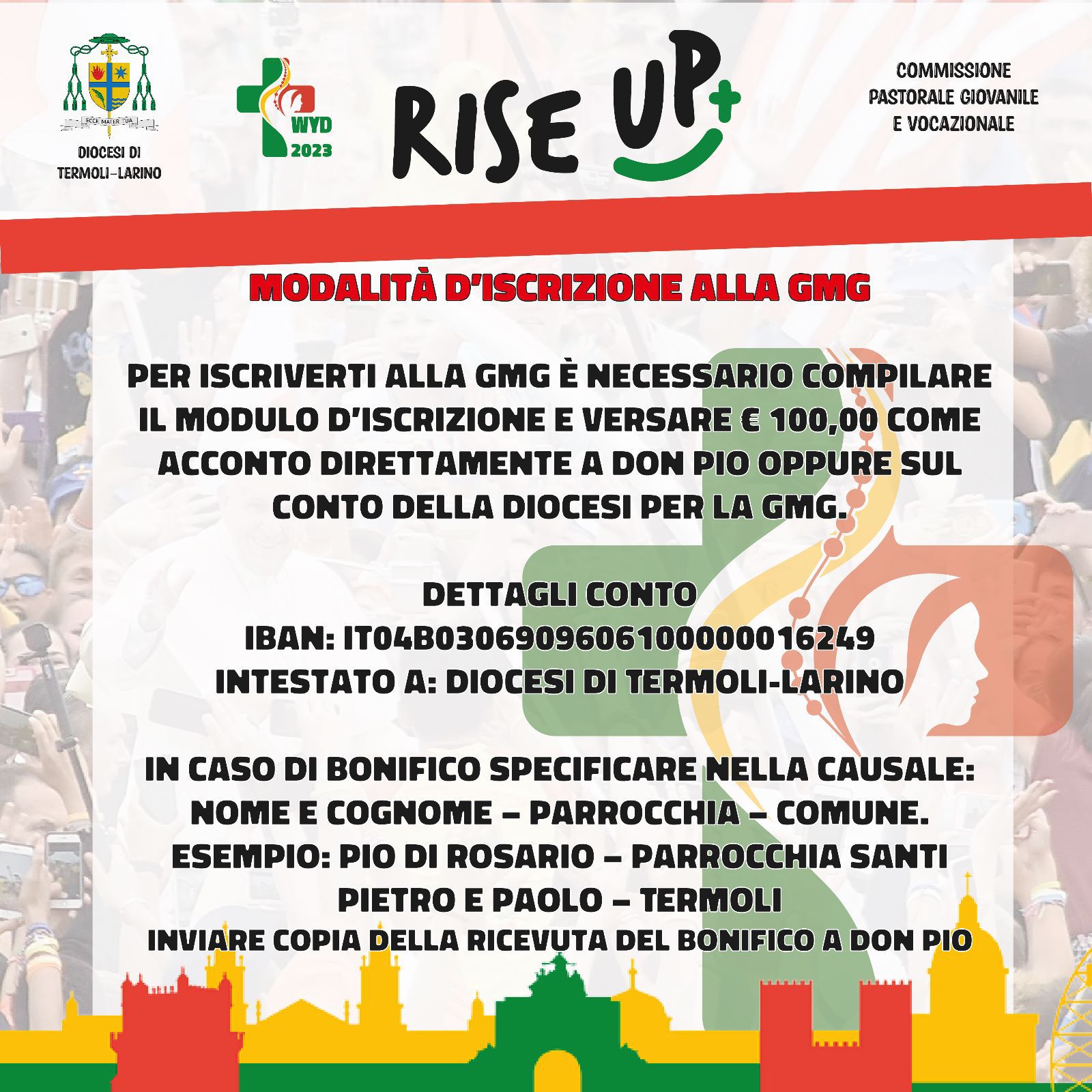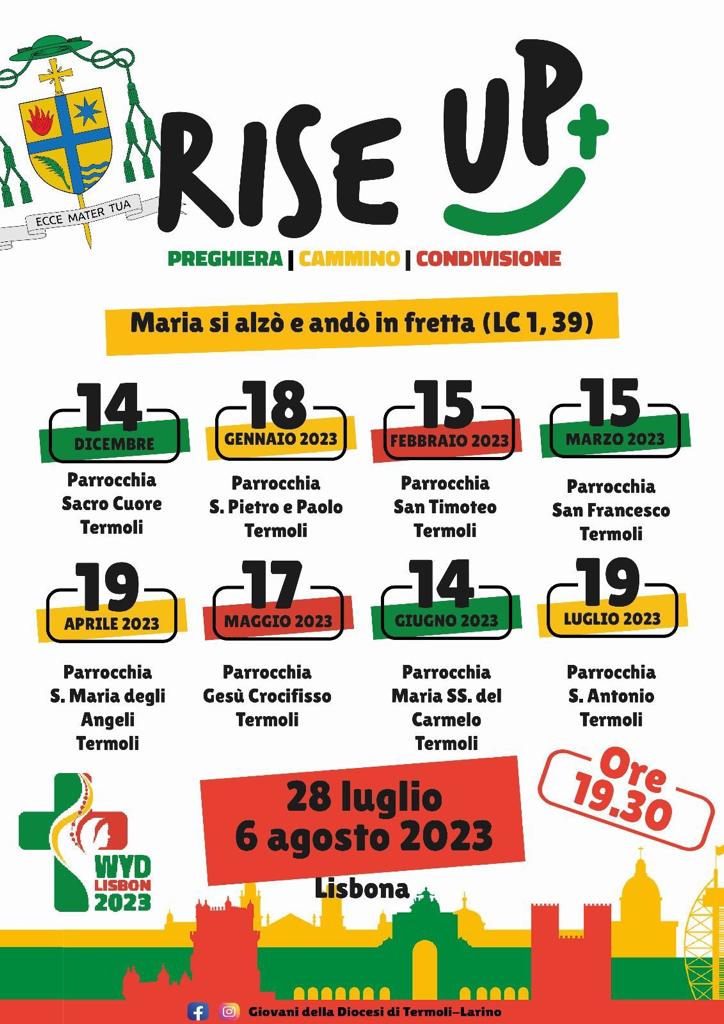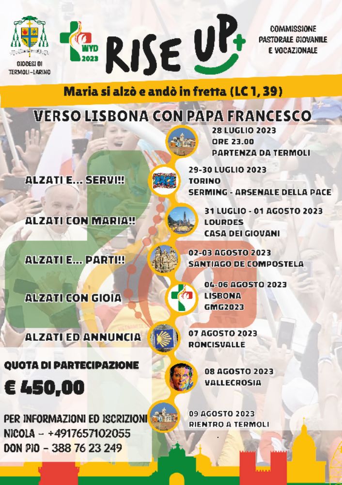 Continua il percorso che porterà alla Giornata Mondiale della Gioventù in programma dal 28 luglio al 9 agosto 2023 a Lisbona, in Portogallo. Si tratta di un’esperienza unica, che richiamerà migliaia di giovani da tutto il mondo nella capitale del Portogallo. Tante attività, tante iniziative, un’opportunità per incontrare persone di ogni nazionalità per condividere momenti di conoscenza, crescita e valorizzazione dei talenti di ognuno. Parola d’ordine: rise-up! Ovvero alzati! Per vivere la vita con entusiasmo, partecipazione e pienezza. È possibile contattare anche la pagina Facebook Giovani della diocesi di Termoli-Larino o iscriversi al gruppo Instagram o Whatsapp. Tutti possono partecipare, un’occasione da non perdere per crescere insieme nella bellezza della vita.
