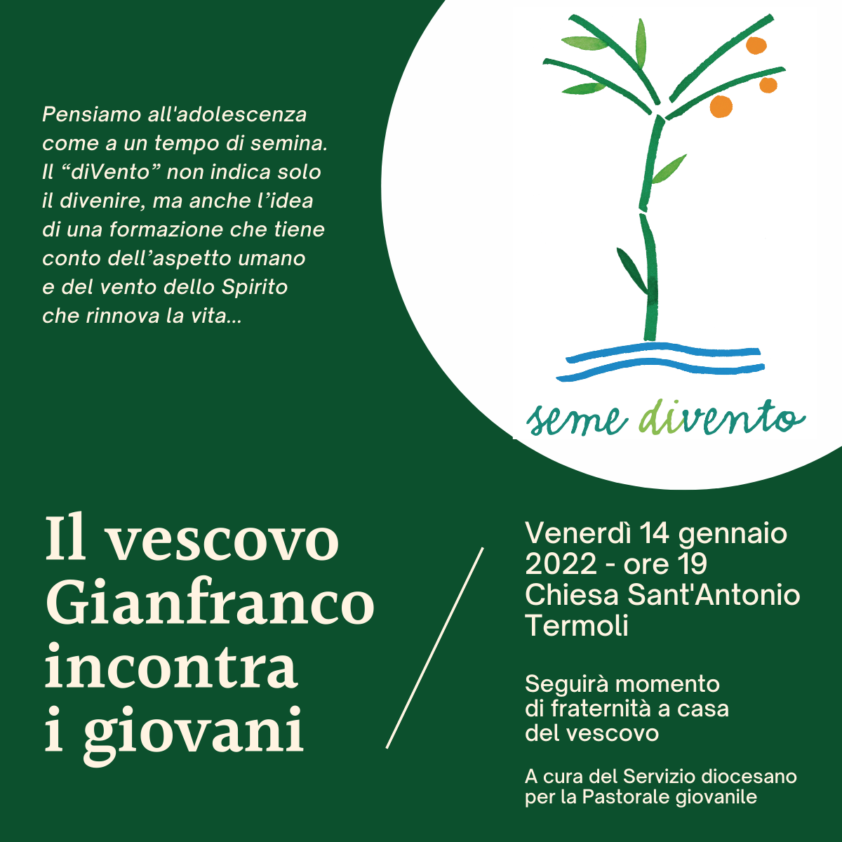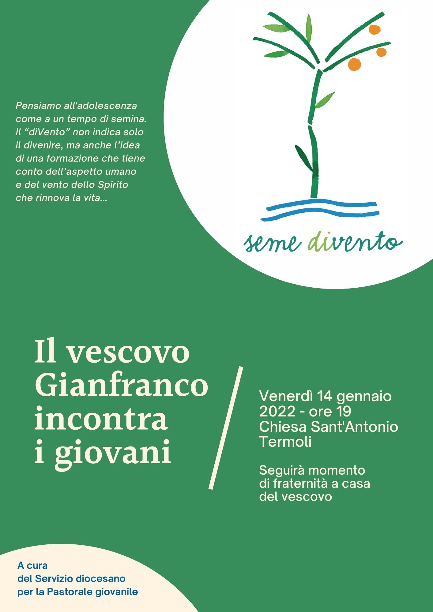 Venerdì 14 gennaio 2022, alle 19, nella chiesa di Sant’Antonio a Termoli il vescovo, Gianfranco De Luca, incontrerà i giovani del territorio. L’iniziativa, promossa dal servizio diocesano per la Pastorale giovanile, si inserisce nelle proposte di incontro con gli adolescenti nel corso del tempo ordinario e riprende anche il cammino del “Dove due o più”.