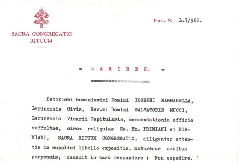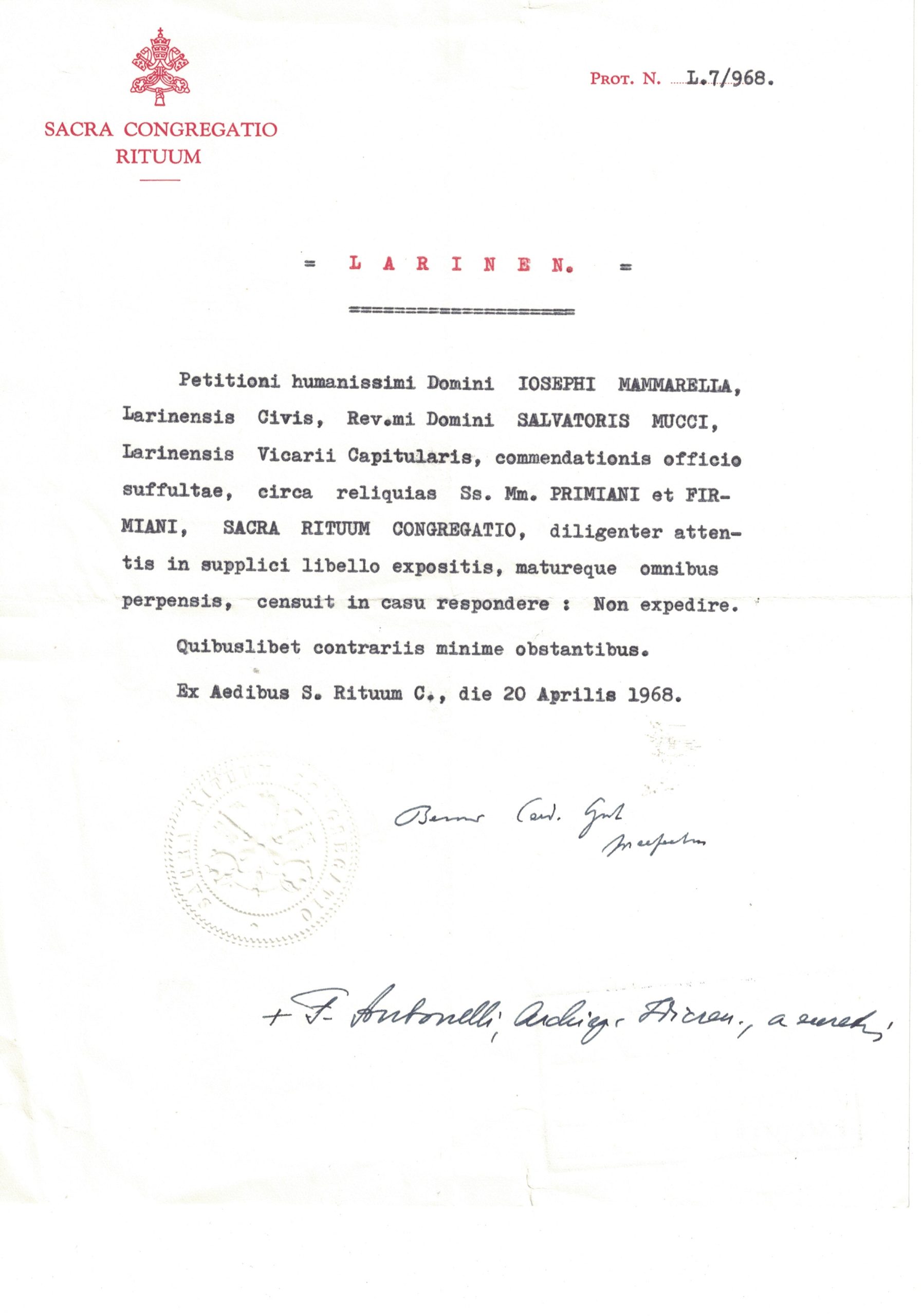 La mia richiesta, ritenuta meritevole dal compianto mons. Salvatore Mucci, Vicario capitolare (figura che, fino all’entrata in vigore del nuovo Codice di diritto canonico del 1983, fungeva da Vescovo in caso di sede vacante), fu inoltrata alla “Sacra Congregatio Rituum” che, in data 20 aprile 1968 così si espresse (traduzione dal latino): “ = (Diocesi) DI LARINO = In merito alla richiesta del gentile Cittadino Larinese Signore Giuseppe Mammarella, supportato dall’ufficio del Reverendissimo Signore Salvatore Mucci, Vicario Capitolare di Larino, relativamente alle reliquie dei Santi Martiri Primiano e Firmiano, la Sacra Congregazione dei Riti, esaminata con cura la richiesta esposta nell’istanza, considerati tutti gli aspetti, decise di rispondere per ogni evenienza: Non conviene (non procedere). Nonostante qualsiasi disposizione contraria. Dalla sede della Sacra Congregazione dei Riti, 20 aprile 1968. (Firmato) Benno Card. (Cardinale) Gut, Prefetto; F. (Ferdinando) Antonelli, Arcivescovo (Titolare) di Idicra, Segretario”.