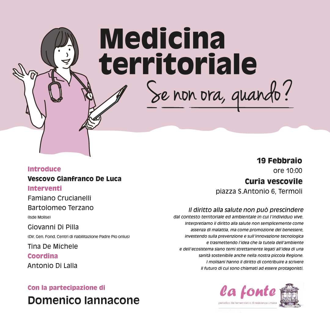 Durante i mesi più duri della pandemia, questa diocesi ha raccolto le istanze sollevate da tante associazioni impegnate sul territorio, come La Fonte Molise onlus, che sottolineavano la necessità di potenziare l’assistenza territoriale. Ora si torna a chiedere una maggiore attenzione a questo tema, fondamentale per fornire un’adeguata assistenza sanitaria ai cittadini. Infatti, grazie ai fondi del Piano Nazionale di Ripresa e Resilienza, c’è la possibilità di superare le principali lacune della nostra sanità, che il Covid ha fatto emergere con inaudita violenza.