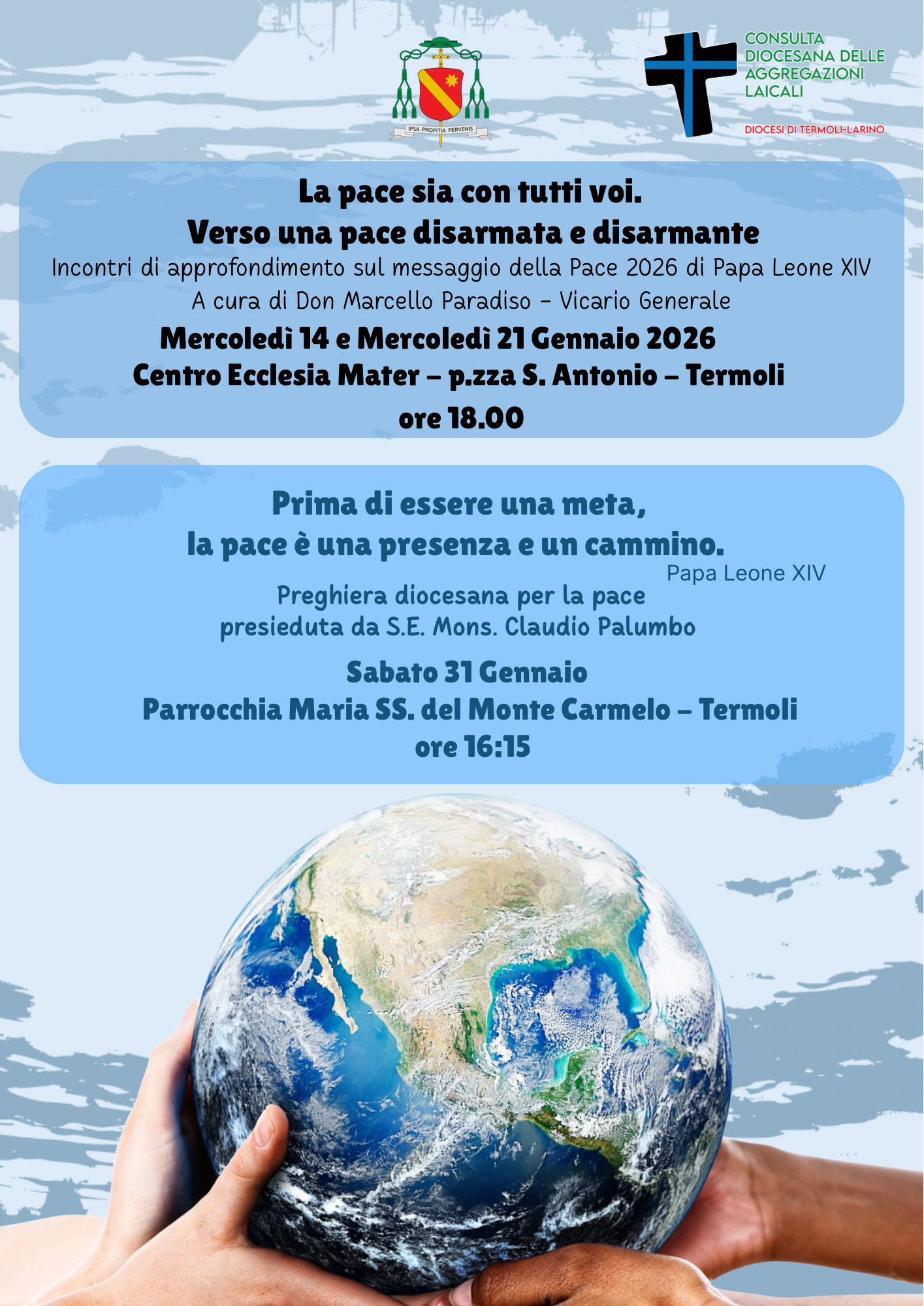 Anche quest’anno la Consulta diocesana per le aggregazioni laicali della diocesi di Termoli-Larino desidera dedicare il mese di gennaio ad un’ampia riflessione sul tema della Pace avendo come filo conduttore il messaggio di Papa Leone XIV per la Giornata Mondiale della Pace 2026: La pace sia con tutti voi. Verso una pace disarmata e disarmante.
