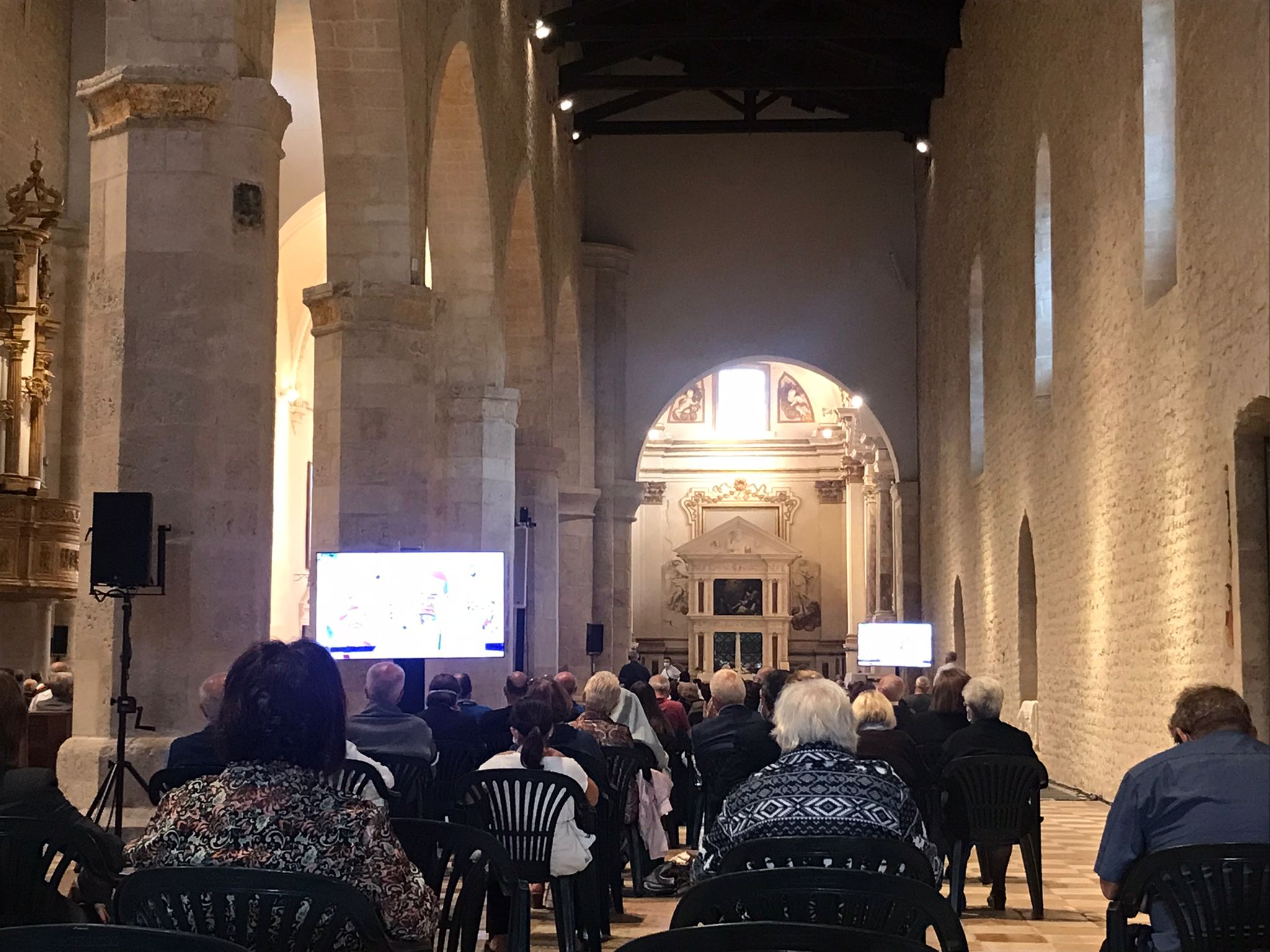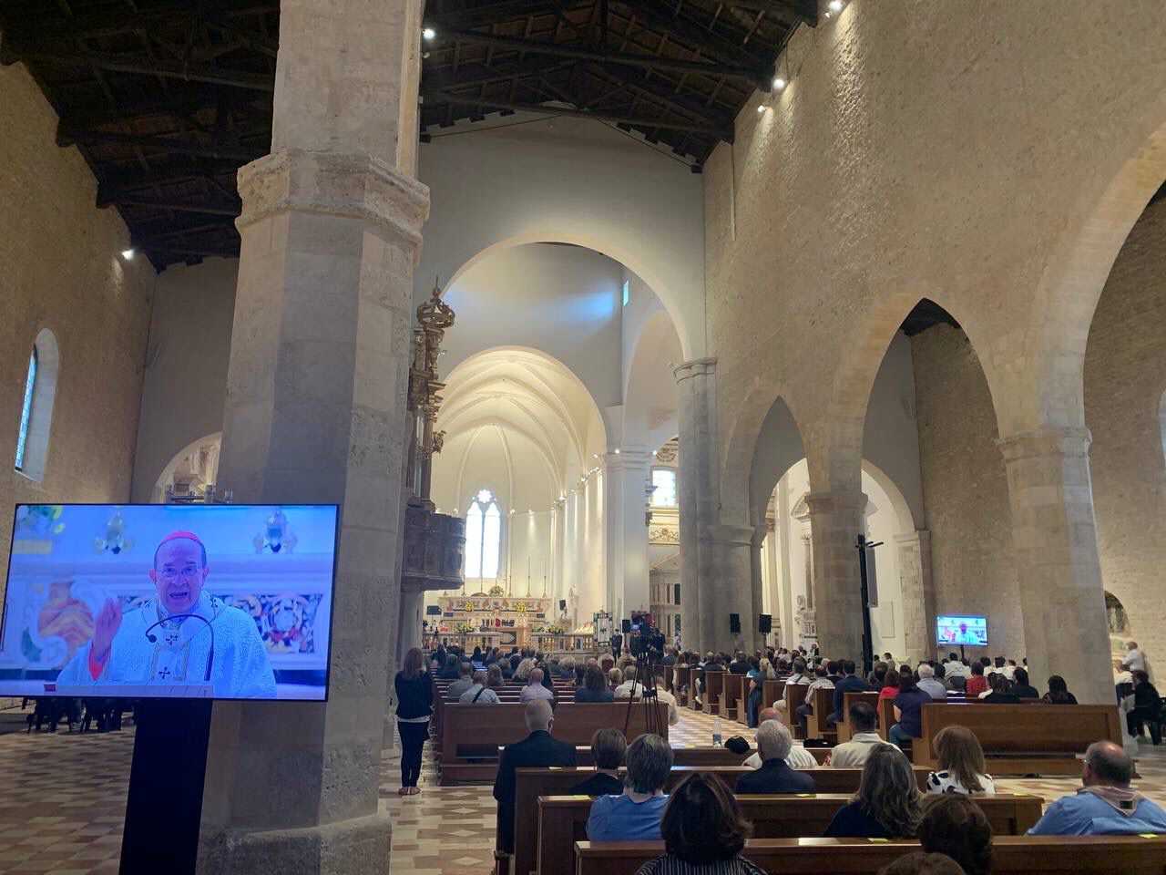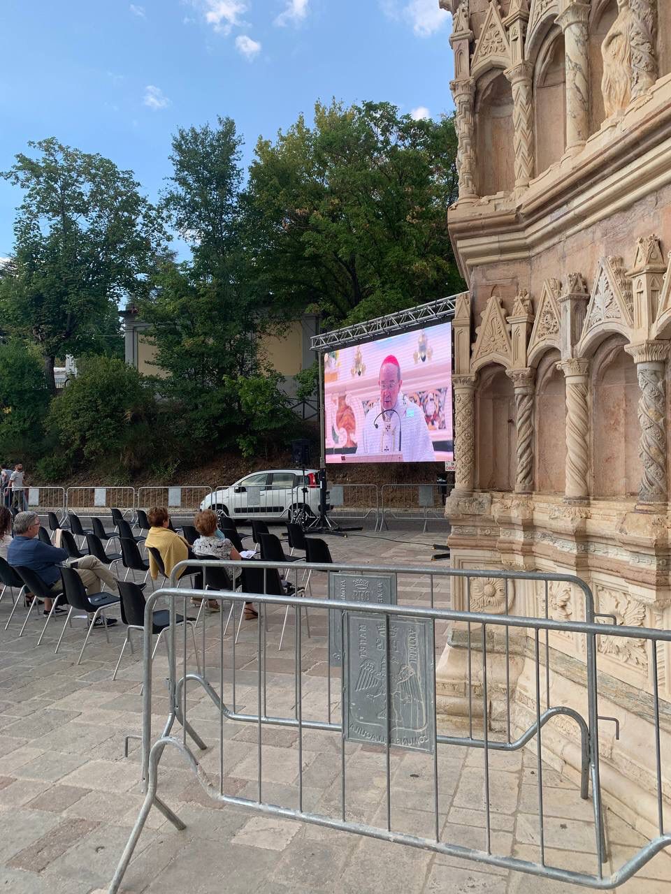 Nel rispetto delle norme antipandemia, l’ingresso nella basilica di Santa Maria di Collemaggio è stato contingentato. L’Arcidiocesi ha predisposto comunque un maxischermo sul piazzale antistante la basilica di Collemaggio da dove i Fedeli che non sono riusciti ad entrare in chiesa hanno potuto seguire la celebrazione.