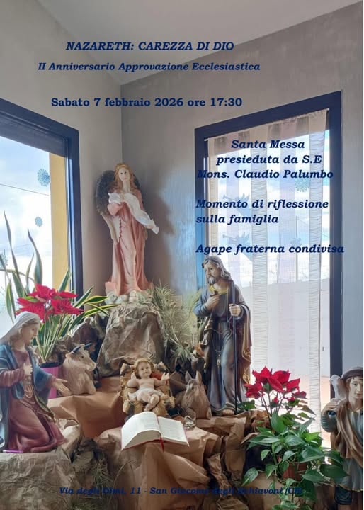 Dal territorio 7 Febbraio 2026 Nazareth: carezza di Dio. Secondo anniversario approvazione ecclesiastica Nazareth: carezza di Dio. Secondo anniversario approvazione ecclesiastica. Ci troviamo in via degli Olmi, 11 a San Giacomo degli Schiavoni, a breve distanza da Termoli. condividi su