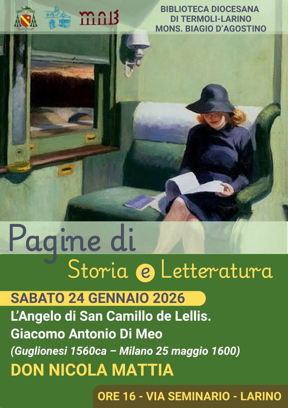 Appuntamento alla Biblioteca diocesana “Mons. Biagio D’Agostino” a Larino, sabato 24 gennaio 2026, con il quarto incontro del ciclo “Un libro per coltivarsi” – “Pagine di storia e letteratura”. Ospite don Nicola Mattia, autore del testo “L’Angelo di San Camillo de Lellis. Giacomo Antonio Di Meo (Guglionesi 1560ca – Milano 25 maggio 1600)”. Con questo incontro si conclude l’approfondimento delle “pagine di storia” e si riprenderà, come da programma, con le “pagine di letteratura” a partire dal prossimo incontro. Programma completo disponibile sul sito diocesano. Iniziativa aperta a tutti.