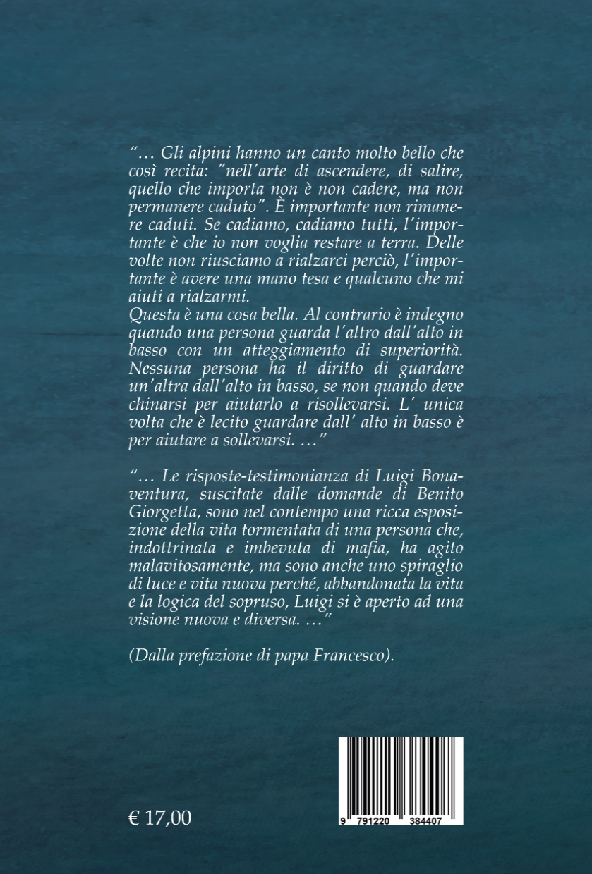 Con la prefazione di papa Francesco, la postfazione di don Luigi Ciotti, il volume cerca di entrare, con discrezione, nel terreno “accidentato” di chi ha praticato la violenza producendo morte e divisioni. Il suo stile di vita era ispirato alla logica mafiosa. In seguito, cambiando mentalità, ha conosciuto la stagione della rinascita, della rifioritura, essendo passato alla riva opposta: la legalità. Una metamorfosi.