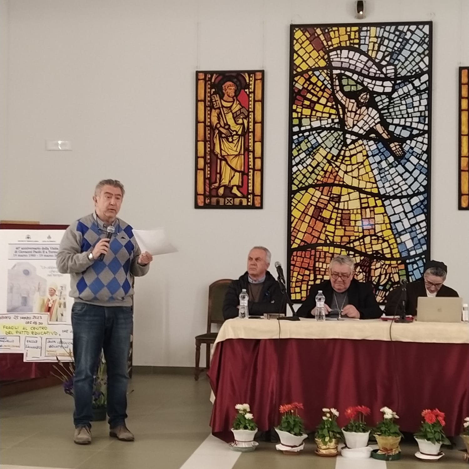 Nel suo intervento il vescovo, mons. Gianfranco De Luca, ha evidenziato il senso delle iniziative del quarantennale. “Questa settimana è nata sull’onda della memoria del viaggio di Giovanni Paolo II di 40 anni fa a Termoli, quando nei due interventi il Papa parlò della necessità del cambiamento per il nostro sud, e poi, durante l’omelia, parlò invece di una società in cui cominciava a venir meno il riferimento alla figura del padre (ed eravamo nel 1983). Sono passati 40 anni ma il tema educativo si è aggravato. Papa Ratzinger ha parlato di emergenza educativa e Papa Francesco, in positivo, ha lanciato il patto educativo, richiamando l’immagine del villaggio come luogo di educazione dei giovani”.