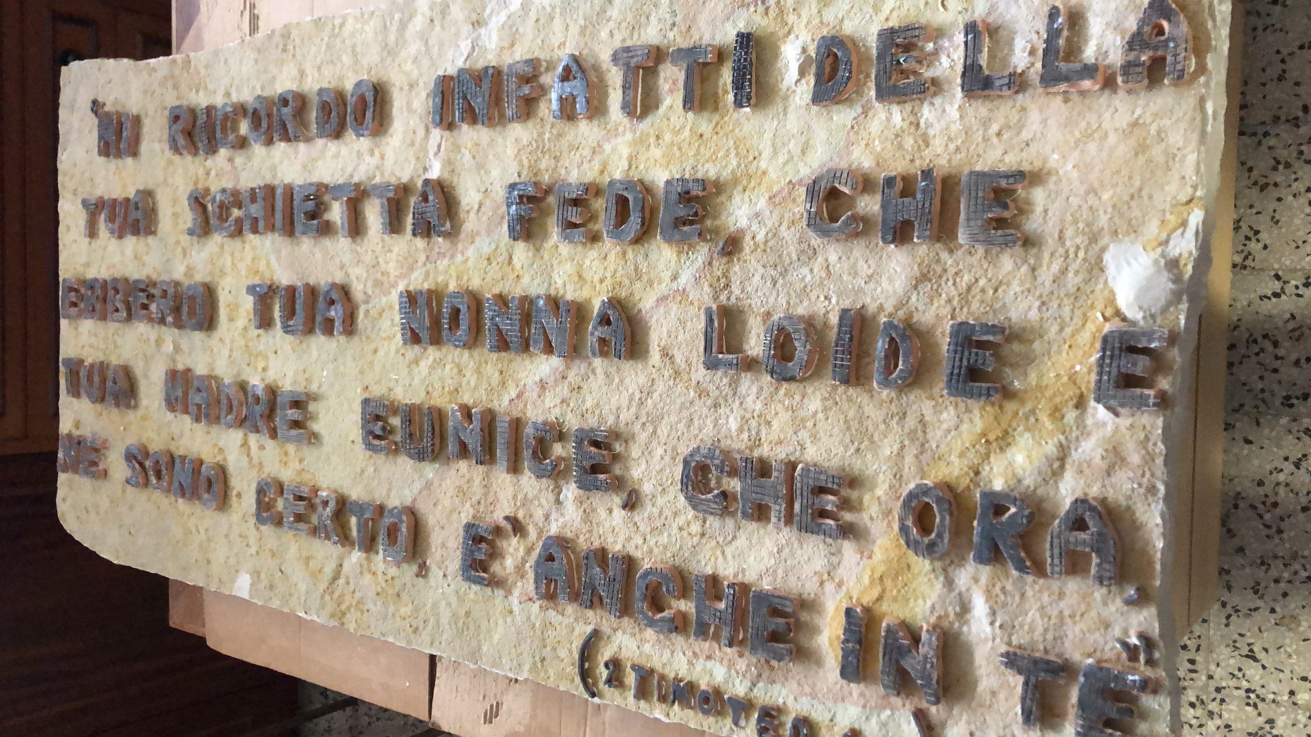 Il Papa non ha mai fatto mistero d’essere molto devoto a san Timoteo, vescovo di Efeso, soprattutto per le figure della nonna e della mamma che sono citate nella seconda lettera di Paolo a lui indirizzata. “Mi tornano alla mente le tue lacrime e sento la nostalgia di rivederti per essere pieno di gioia. Mi ricordo infatti della tua fede schietta, fede che fu prima nella tua nonna Lòide, poi in tua madre Eunìce e ora, ne sono certo, anche in te” (2 Timoteo 1,4-5). Per questo motivo sul masso che ospiterà le sculture sarà riproposta la frase biblica e la dedica al “Santo Padre Papa Francesco”.