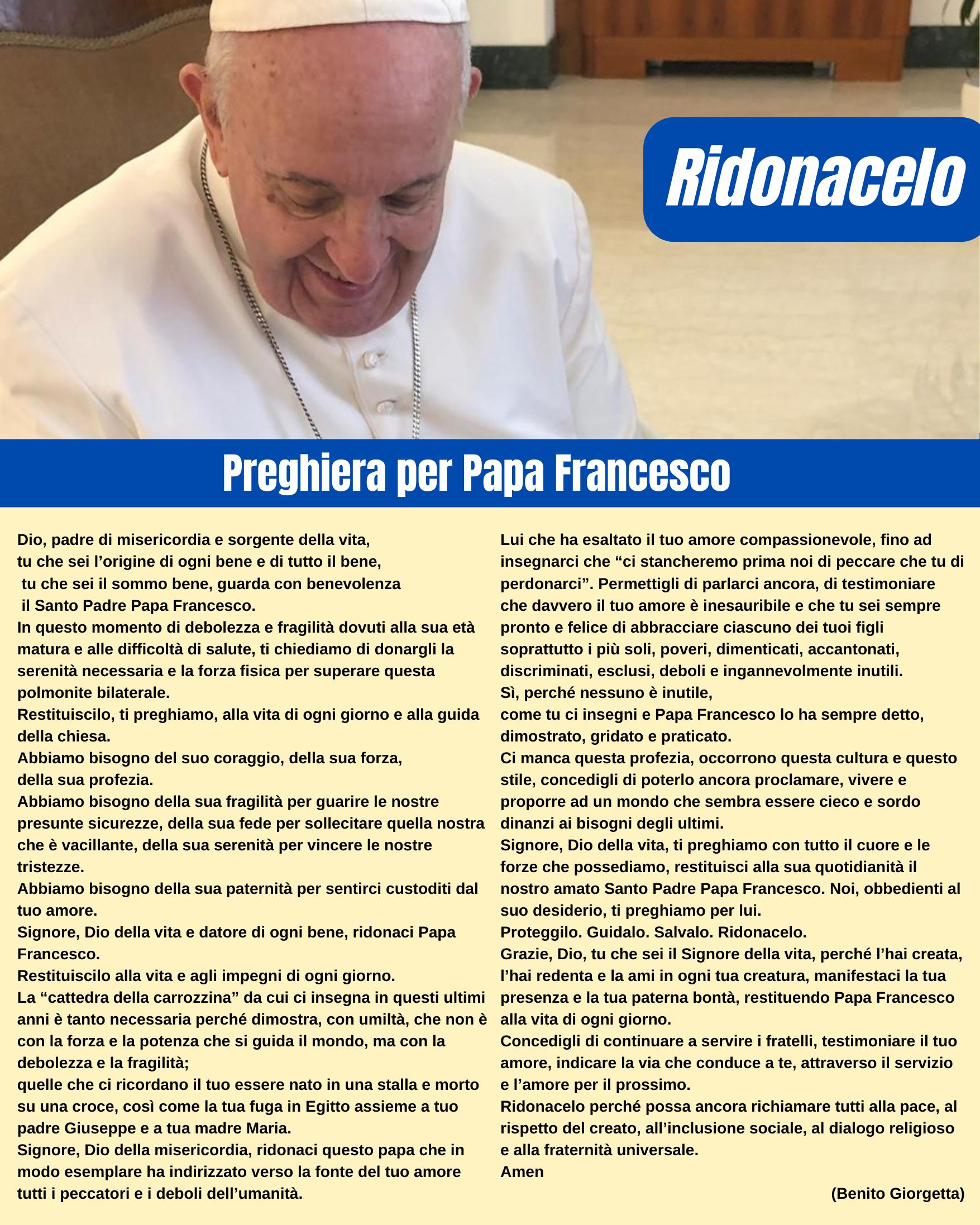 PREGHIERA PER PAPA FRANCESCO di don Benito Giorgetta inviata e ricevuta dal Santo Padre: