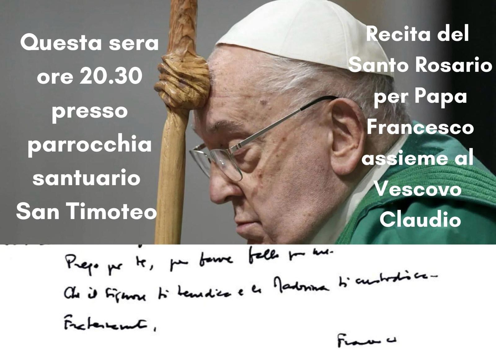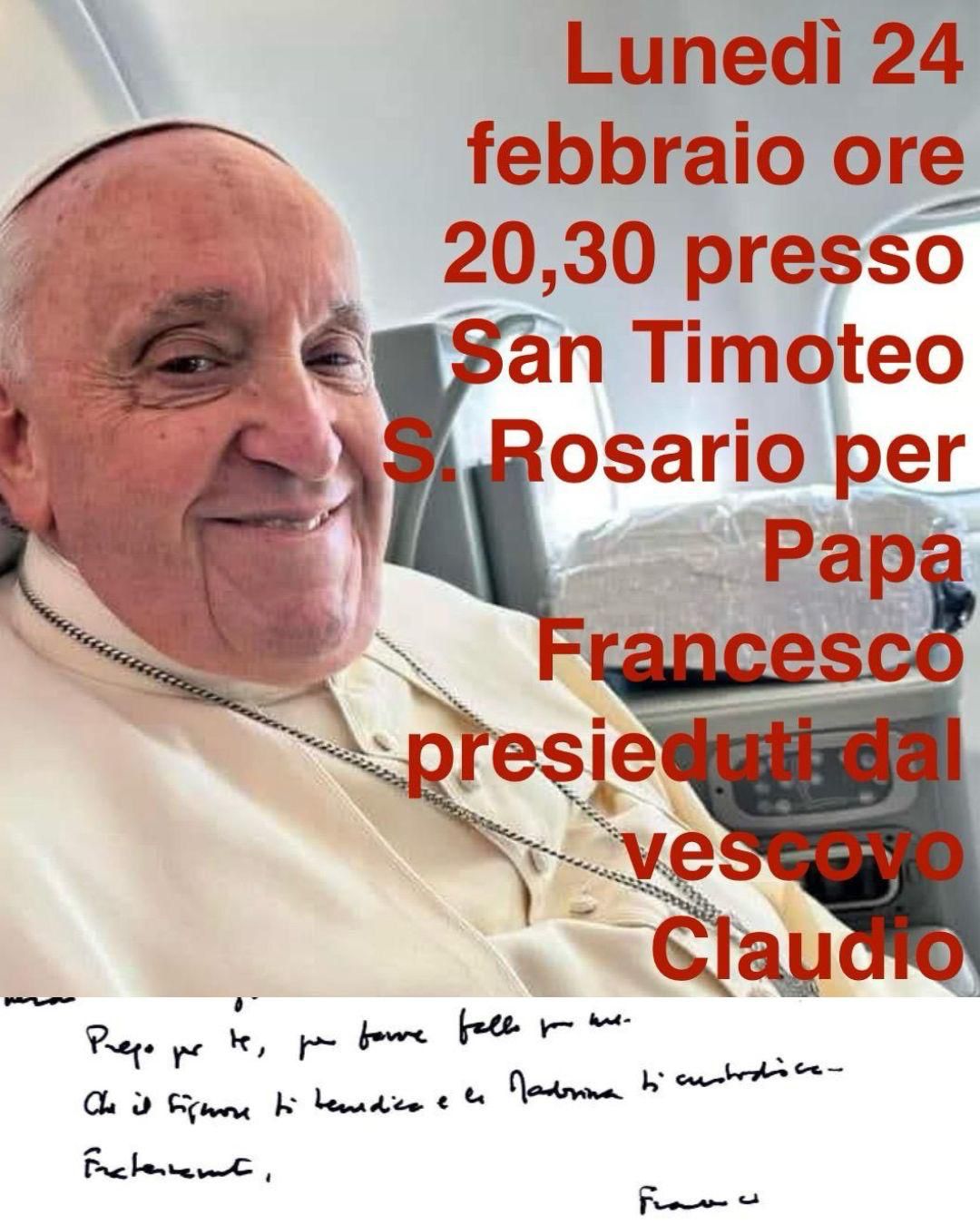 LUNEDI’ 24 FEBBRAIO 2025 ORE 20,30 PRESSO PARROCCHIA SANTUARIO SAN TIMOTEO RECITA DEL SANTO ROSARIO PER PAPA FRANCESCO. PRESIEDE IL NUOVO VESCOVO MONS. CLAUDIO PALUMBO. TUTTI SONO INVITATI A PARTECIPARE