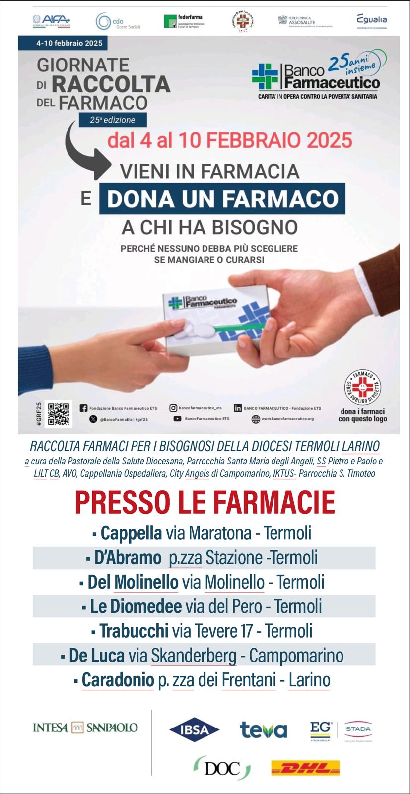 Martedì 4 febbraio inizieranno le GIORNATE DI RACCOLTA DEL FARMACO DEL BANCO FARMACEUTICO NAZIONALE, a favore della Caritas Diocesana, delle Parrocchie e delle Associazioni collegate, che durerà fino all’11 febbraio, presso le farmacie Cappella, D’Abramo, Del Molinello, Le Diomedee e Trabocchi di Termoli, De Luca di Campomarino e Caradonio di Larino.