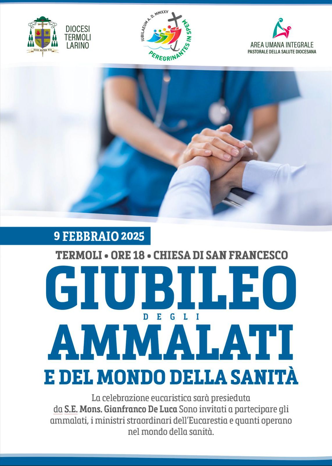 della Salute Diocesana Domenica 9 febbraio alle 18 nella Chiesa della Parrocchia di San Francesco di Termoli ci sarà la Santa Messa con il GIUBILEO degli Ammalati e del Mondo della Sanità, presieduta da S.E. Gianfranco De Luca e animata dall’UNITALSI . Gli eventi della Settimana per la Vita si concluderanno Martedì 11 Febbraio con la Santa Messa della 33esima GIORNATA MONDIALE DEL MALATO presieduta da don Antonio Giannone alle ore 7.30 presso Cappella dell’Ospedale San Timoteo di Termoli, animata da Cappellania Ospedaliera, AVO AiTE e Pastorale della Salute Diocesana e seguita dalla Celebrazione del sacramento dell’unzione degli infermi.