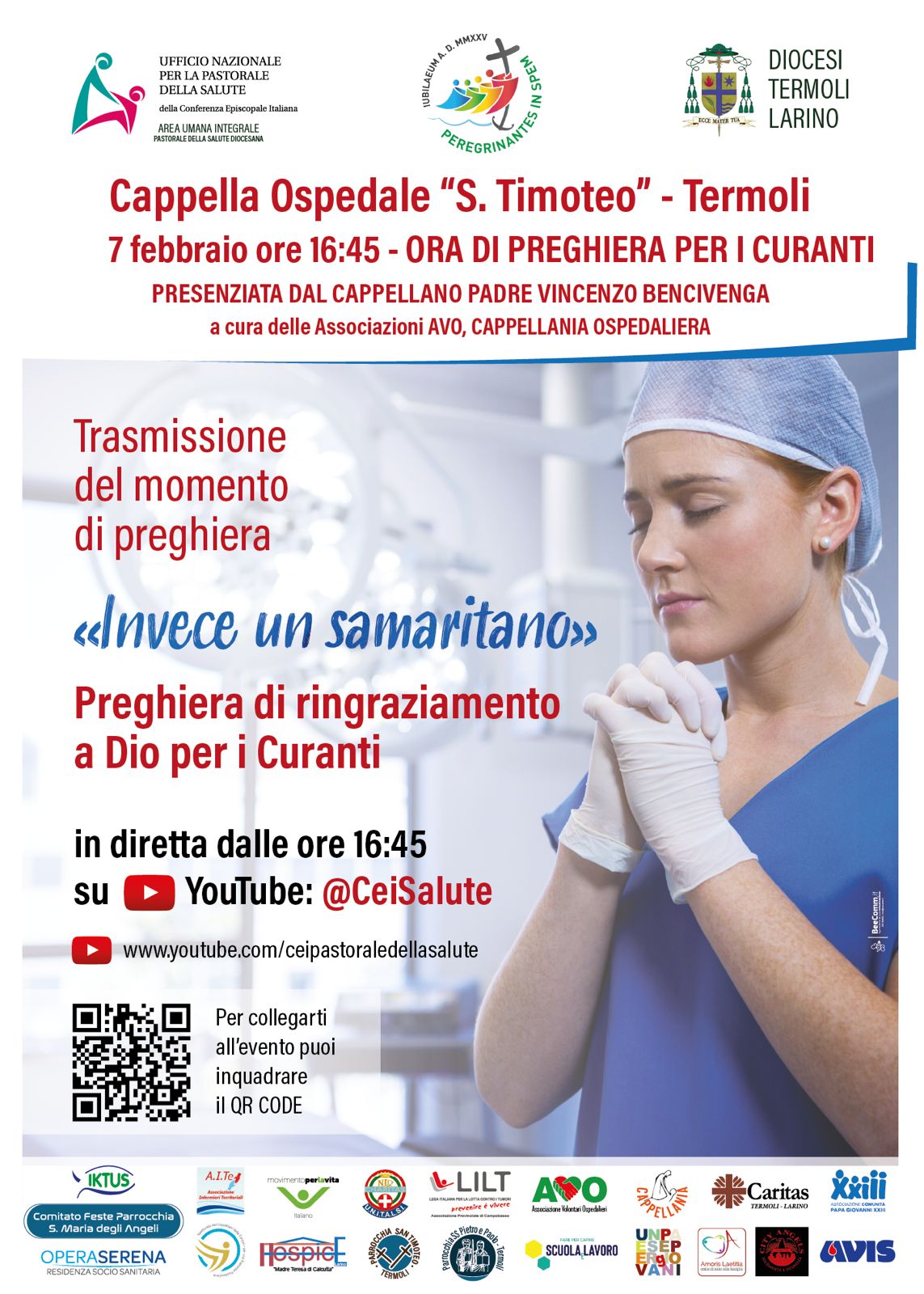 Sempre Venerdì 7 febbraio alle 16, 45 presso la Cappella dell’Ospedale S. Timoteo ci sarà la consueta “Preghiera di Ringraziamento a Dio per i Curanti” guidata dal Cappellano padre Vincenzo Bencivenga e collegamento online con altre Cappellanie Ospedaliere a cura di Cappellania Ospedaliera, AVO e Pastorale