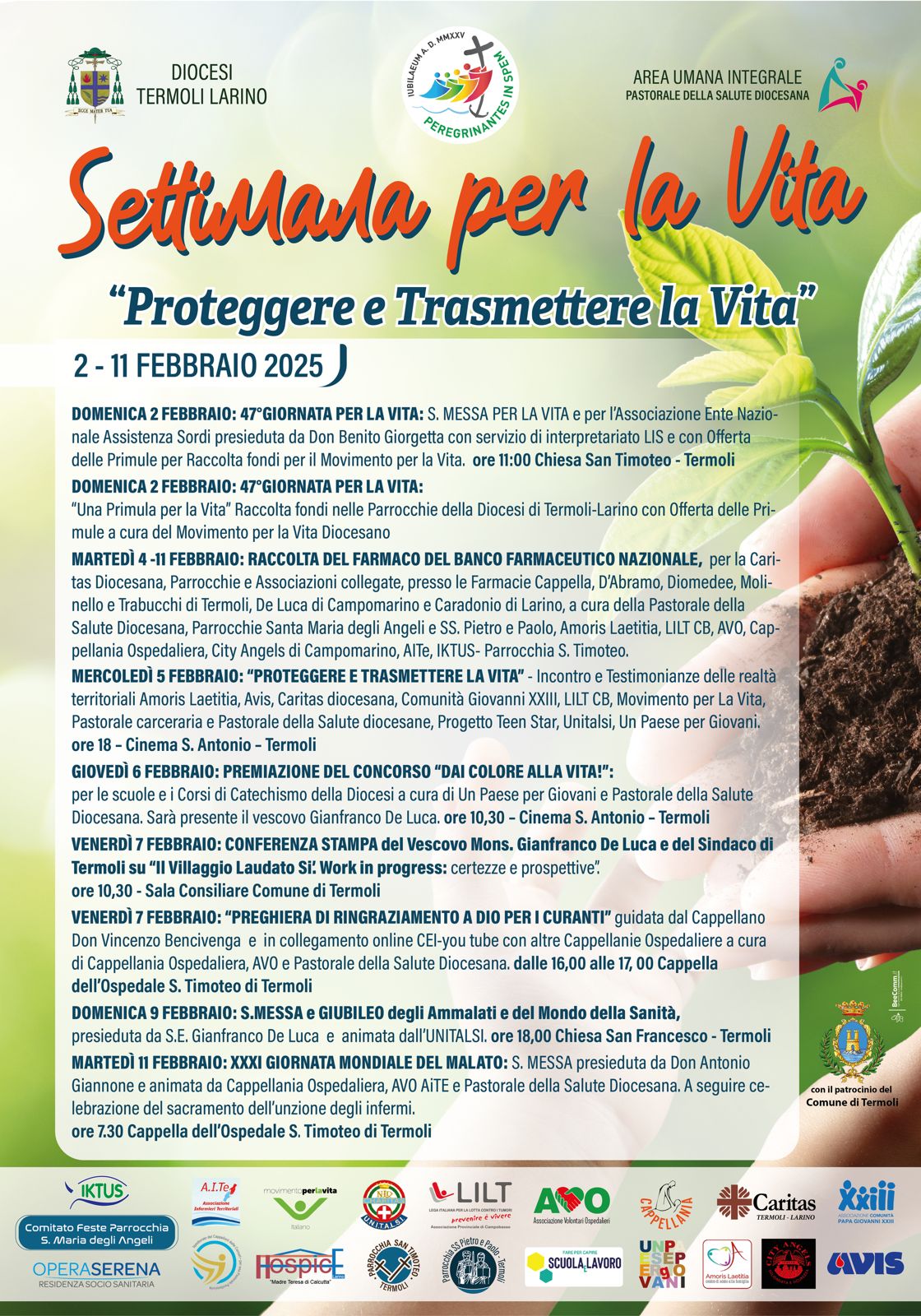 Quest’anno la Settimana per la Vita con il tema “Proteggere e Trasmettere la vita” estrapolato dalla lettera della C.E.I. inviata in occasione della 47° Giornata Nazionale della Vita del 2 febbraio è diventato ancor più che negli scorsi anni il risultato della collaborazione di tutte le componenti dell’AREA UMANA INTEGRALE (A.U.I.), tutte impegnate nella mission della protezione e della trasmissione della vita. Pertanto la PASTORALE della SALUTE DIOCESANA con le Associazioni e Strutture che in essa conferiscono (Avo, Cappellania, Unitalsi , Aite, Lilt Cb, Movimento Per La Vita , Rsa Casa Serena, Hospice ) , ha fatto da elemento coagulatore nel percorso sinodale con le altre strutture organizzative diocesane che conferiscono nella stessa A.U.I. (Caritas Diocesana, Un paese per giovani, Amoris Laetitia, Scuola e Lavoro, Pastorale Giovanile, Pastorale Carceraria), secondo le indicazioni del Vescovo S.E. Mons. Gianfranco De Luca e del Vicario dell’Area di Sviluppo Umano Integrale Don Antonio Giannone, nell’ambito della mission di intercettare e contrastare le Povertà Sanitarie e Sociali del territorio Diocesano: soccorrere e aiutare i bisognosi e i non abbienti.