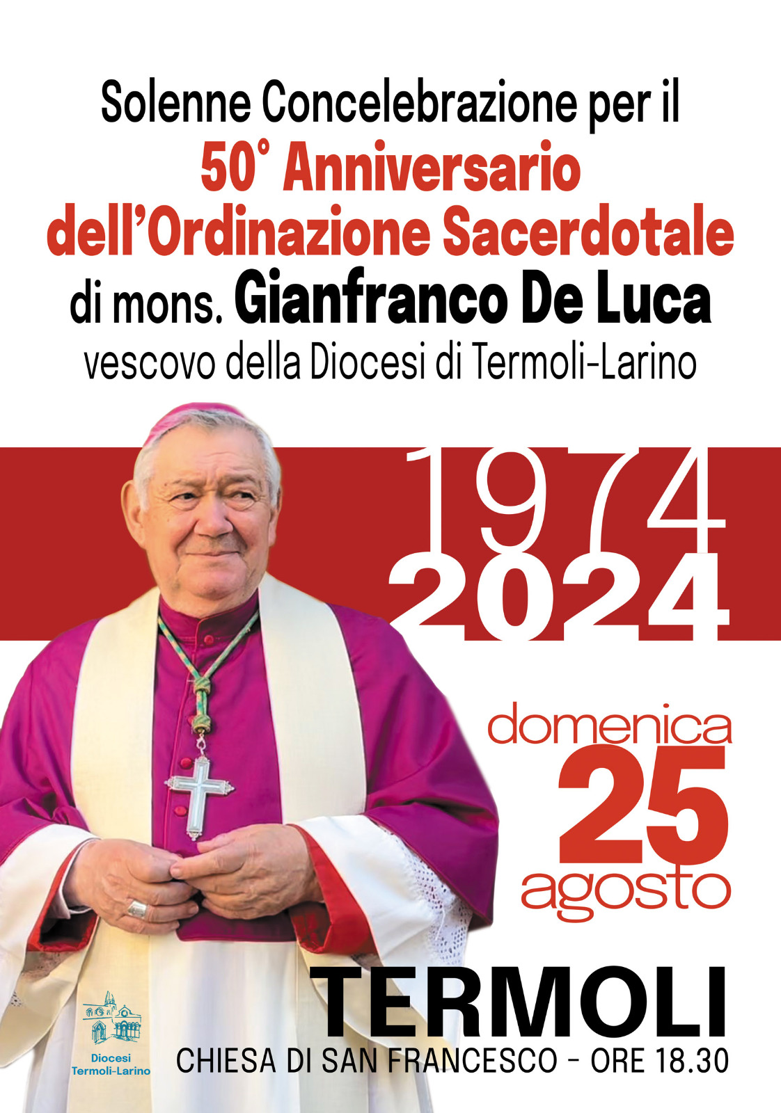 La grazia di Cristo che è il più grande ed il più prezioso di tutti i doni, accompagni sempre il nostro Vescovo Gianfranco. Una rappresentanza di ogni comunità parrocchiale, associazioni e movimenti ecclesiali, sia presente il 25 agosto alla Solenne Concelebrazione alle ore 18.30 nella chiesa di San Francesco in Termoli: si avvisi per tempo che nelle Chiese della diocesi non verrà celebrata la messa vespertina lo stesso giorno.