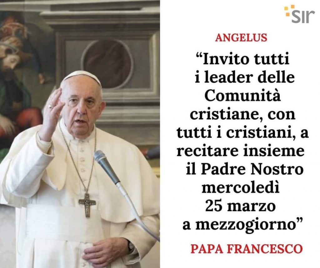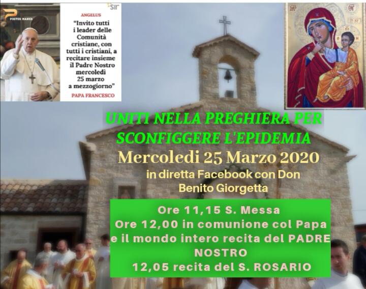 Uniti nella preghiera per sconfiggere l’epidemia. Papa Francesco, nel corso dell’Angelus di domenica scorsa, ha invitato “tutti i leader delle Comunità cristiane, con tutti i cristiani, a recitare insieme il Padre Nostro mercoledì 25 marzo 2020 a mezzogiorno”. Un invito fatto con il cuore e affidamento al Signore per condividere questo grande e significativo abbraccio ed esprimere vicinanza solidale ai malati e a tutte le persone che sono impegnate in prima linea nella lotta contro il coronavirus. In questo giorno ricade anche il quarto anniversario della dedicazione della chiesa di Santa Maria dell’Accoglienza presso la casa famiglia “Iktus – Lucia e Bernardo Bertolino” situata tra Termoli e Guglionesi. Per questo motivo il parroco di San Timoteo e responsabile della struttura, don Benito Giorgetta, ha voluto proporre qui un momento di condivisione e preghiera (in forma privata) che si potrà seguire seguendo la pagina Facebook del sacerdote o la pagina della Diocesi di Termoli-Larino. Il programma prevede: alle 11.15 la Santa Messa; alle 12 – in comunione con il Papa e il mondo intero – la recita del Padre Nostro; alle 12.05 la recita del Santo Rosario.