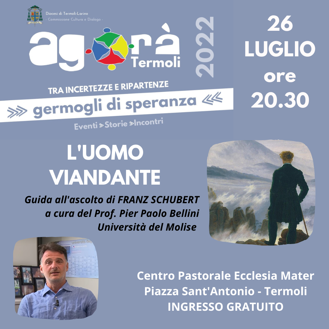 Nell’ambito delle iniziative culturali di Agorà 2022 della diocesi martedì 26 luglio 2022, alle 20.30, nello spazio all’aperto del Centro Pastorale ‘Ecclesia Mater’ di Termoli è in programma una serata dal titolo “L’uomo viandante”. L’evento prevede una guida all’ascolto di Franz Schubert a cura del prof. Pier Paolo Bellini, docente dell’Università del Molise.